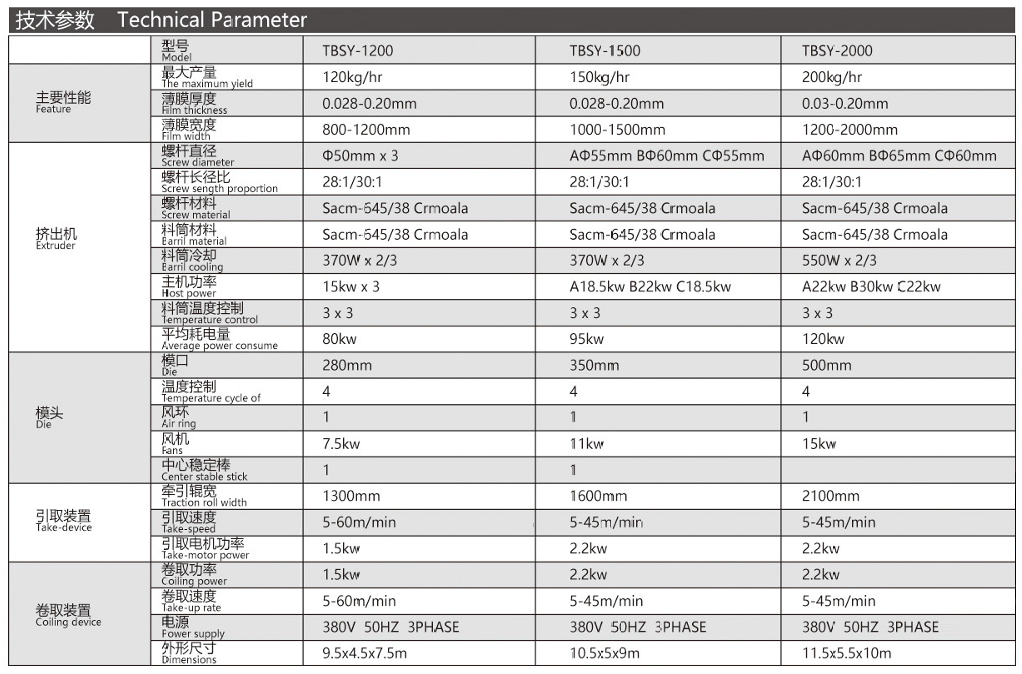 機(jī)器特性 吹制各種規(guī)格的低密度聚乙烯、高密度聚乙烯和線性低密度聚乙烯塑料薄膜,廣泛應(yīng)用于食品百貨、日用、化工 針紡品、購物禮袋和工業(yè)包裝。機(jī)筒、螺桿采用38CrMOAI合金材料經(jīng)氨化處理精密加工而